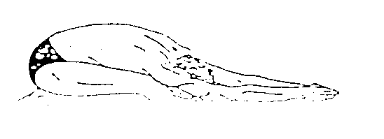 | Ich ziehe mich zur "Gestreckten Katze" zurück; Oberschenkel senkrecht; Kopf in Kinnlage. Auflösung aller Spannungen. |