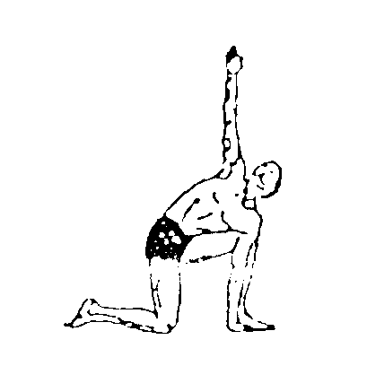 | Starthaltung - makaramatsyendrasana Rechten Fuß zur rechten Hand nach vorne stellen; linken Arm in die Senkrechte hochwinkeln; Kopf dreht mit nach oben; Hand zum Körper offen. Dann Gegenseite. |